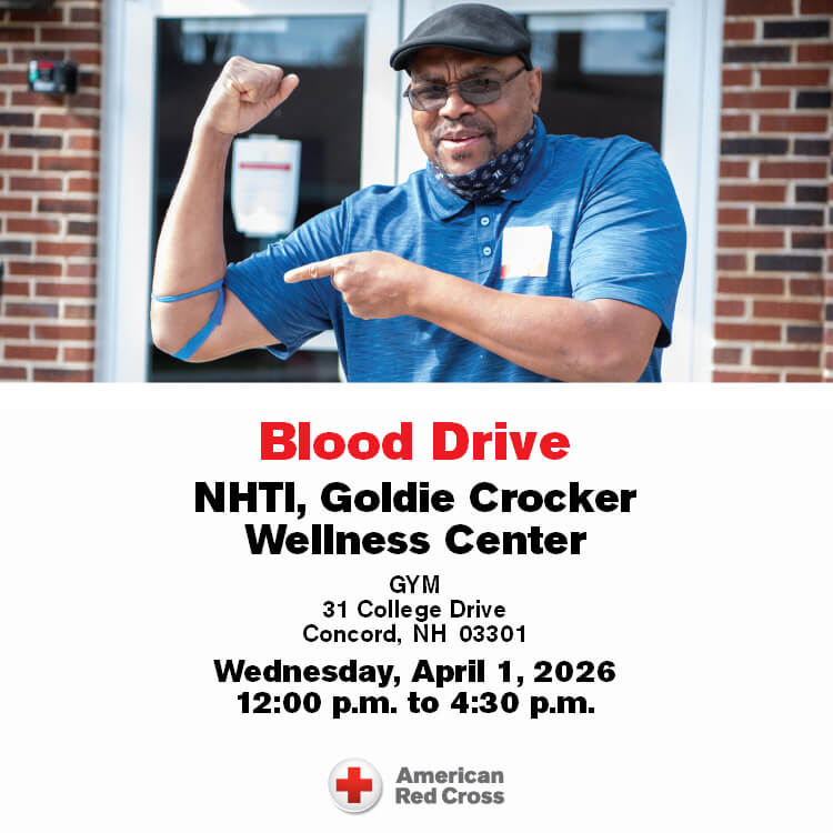 Please join us for a Spring blood drive at NHTI, in our Goldie Crocker Wellness Center Gymnasium Wednesday, April 1, 2026 from 12:00 p.m. to 4:30 p.m. Visit RedCrossBlood.org to schedule an appointment or walk-in!. A little good goes a long way!